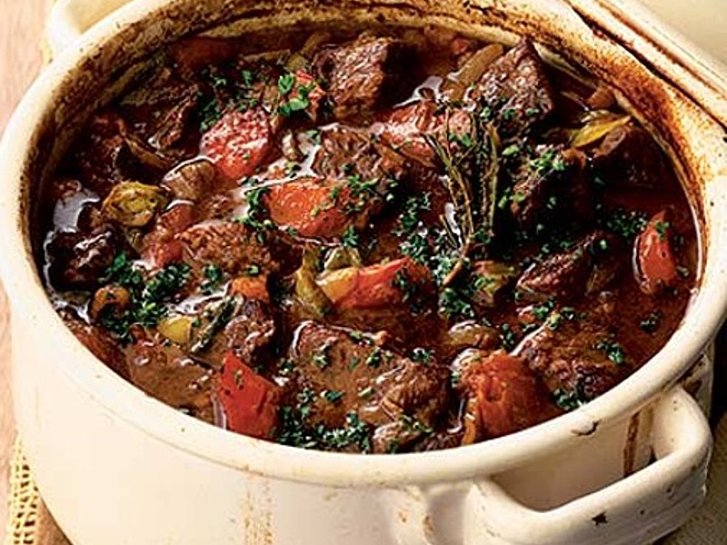 7. Как только соус выпарится, вернуть бекон, лук и мясо в сковороду, добавить букет гарни, залить пивом и посолить. Сверху выложить намазанные горчицей куски хлеба pain d'épices. Не перемешивать! Довести до кипения и оставить тушиться под крышкой на 3 часа.