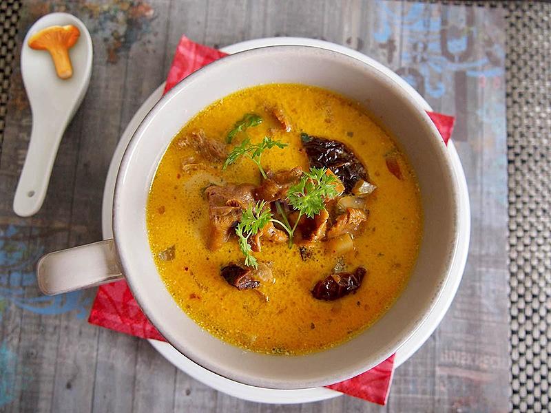 4. Раскрошить шафран в бренди и влить это к грибам с луком. Увеличить огонь и перемешивать грибы до тех пор, пока бренди не испарится. Потом превратить грибы в пюре блендером.