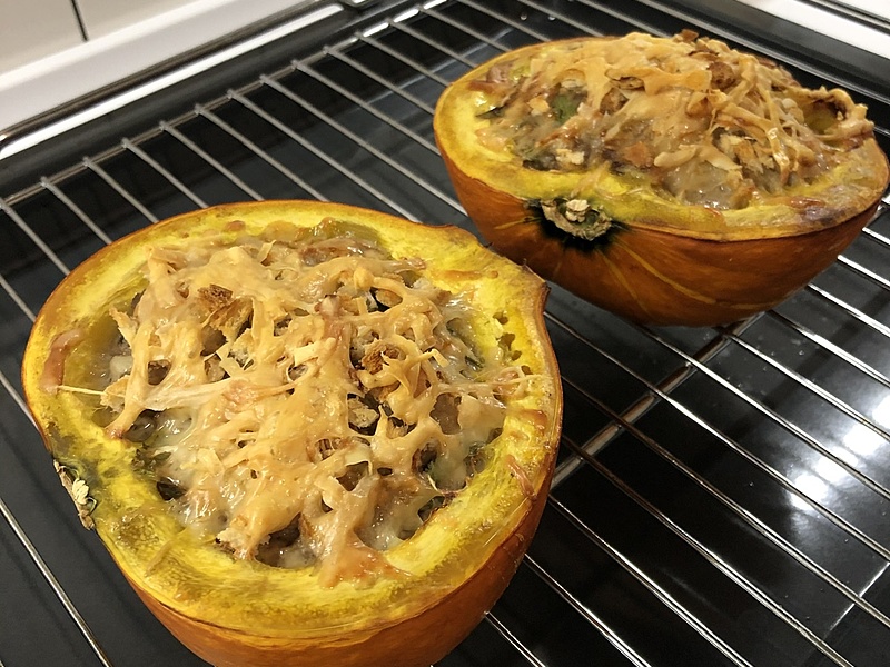 5. Разложить фарш в половинки тыквы, посыпать сверху перемолотыми крошками хлебных корочек и тертым сыром, побрызгать оливковым маслом.
