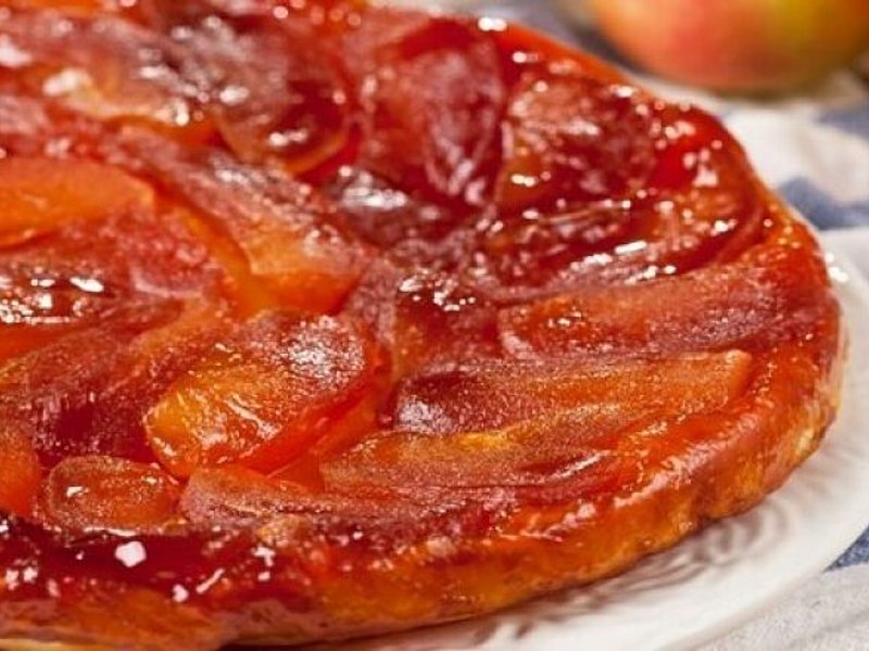 7. При подаче отрезать кусок пирога и выложить на тарелку, перевернув его. Можно полить его горящим кальвадосом, на каждый кусок хватит по 10 мл. Перед тем, как поджечь кальвадос, его надо подогреть.
