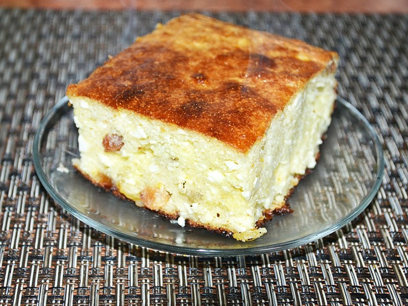 4. Добавить изюм в творожную смесь, перемешать. Выложить в форму для запекания.